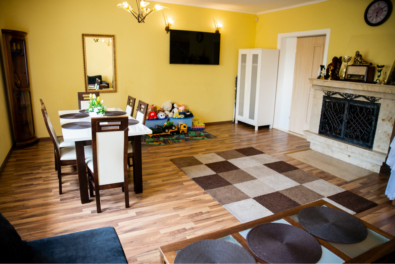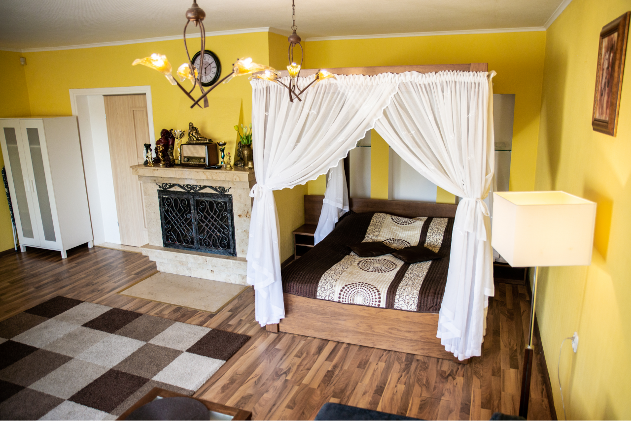 Salon z kominkiem, łoże z baldachimem, narożna kanapa z funkcja spania, szafa, stół na 6 osób ( drewno do kominka dodatkowo płatne ), TV.