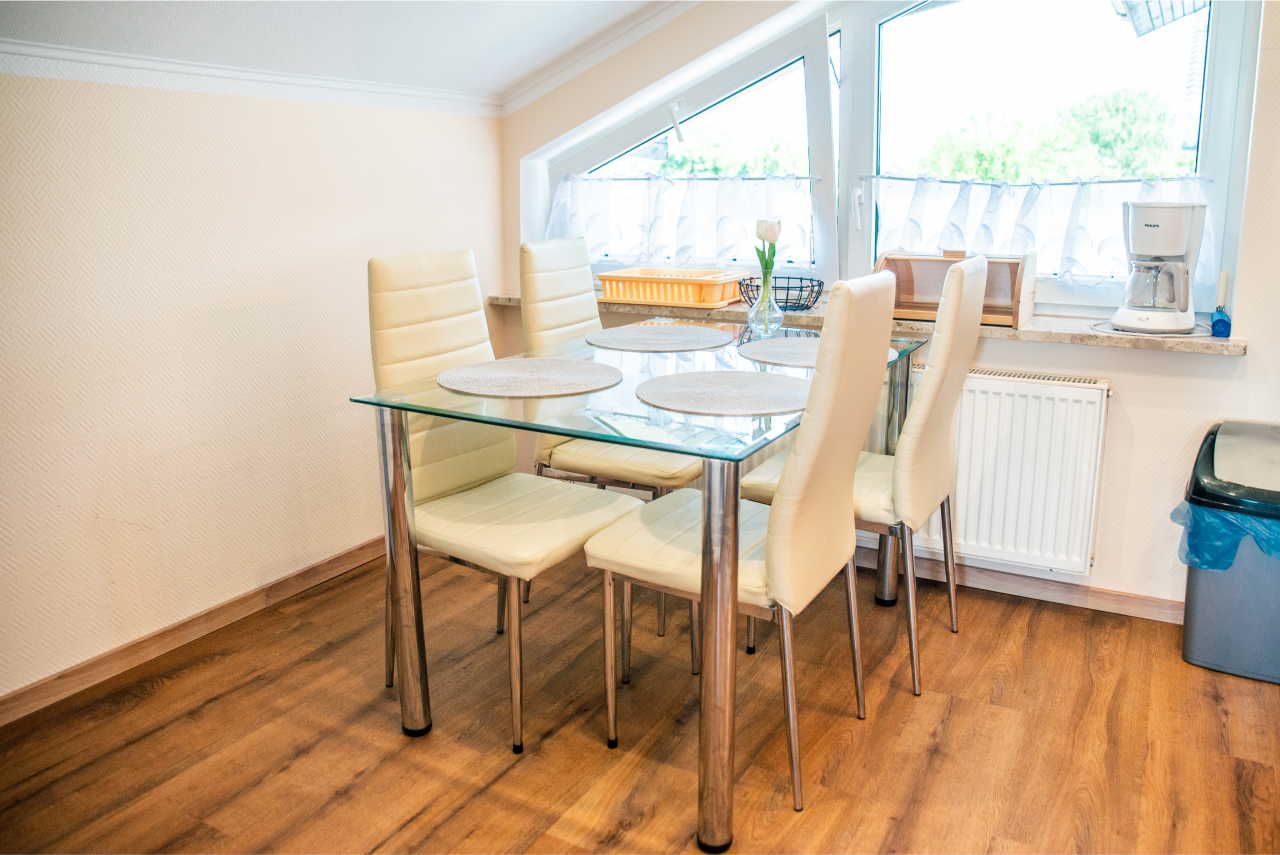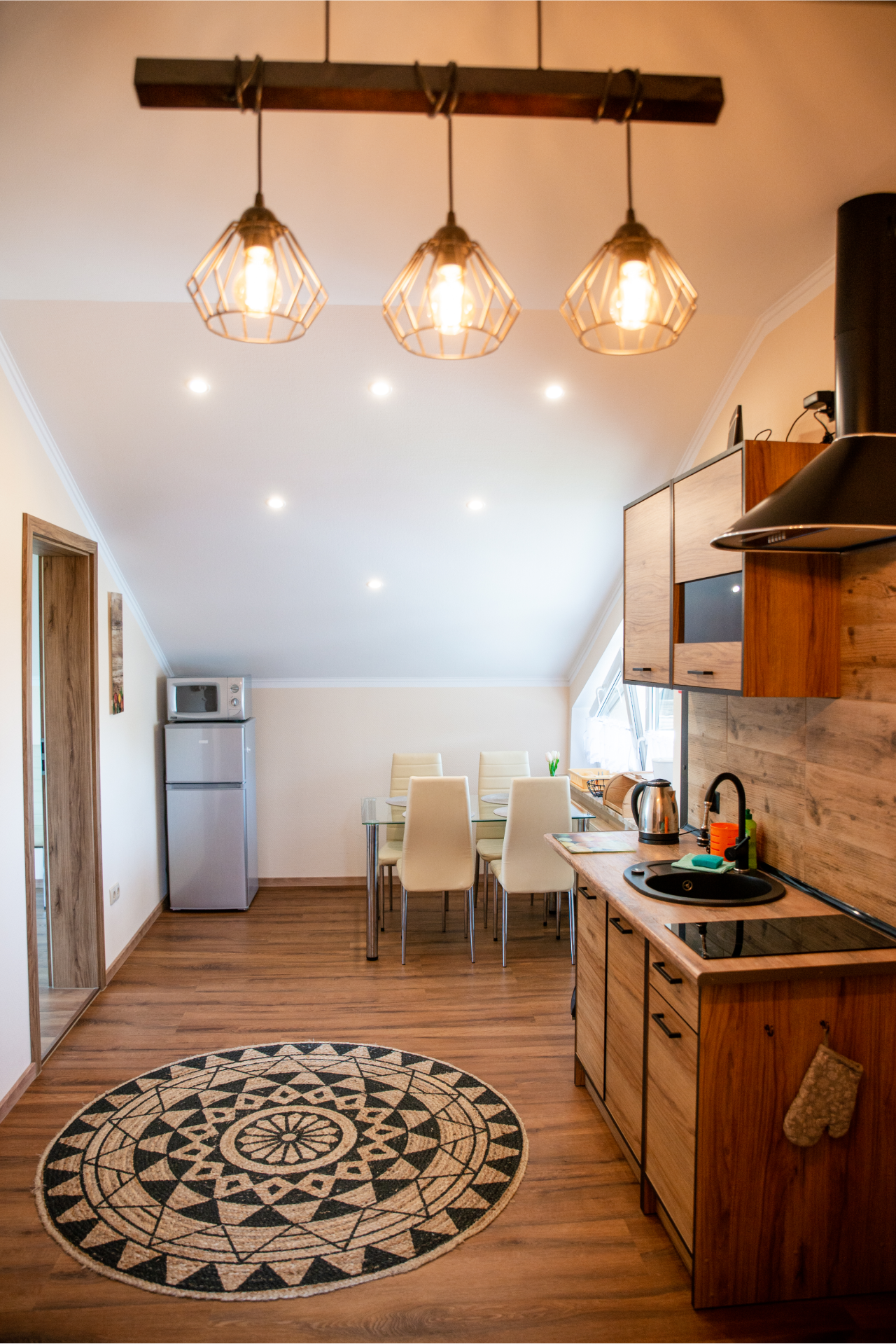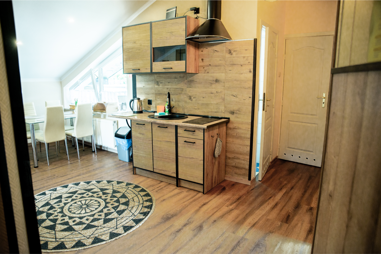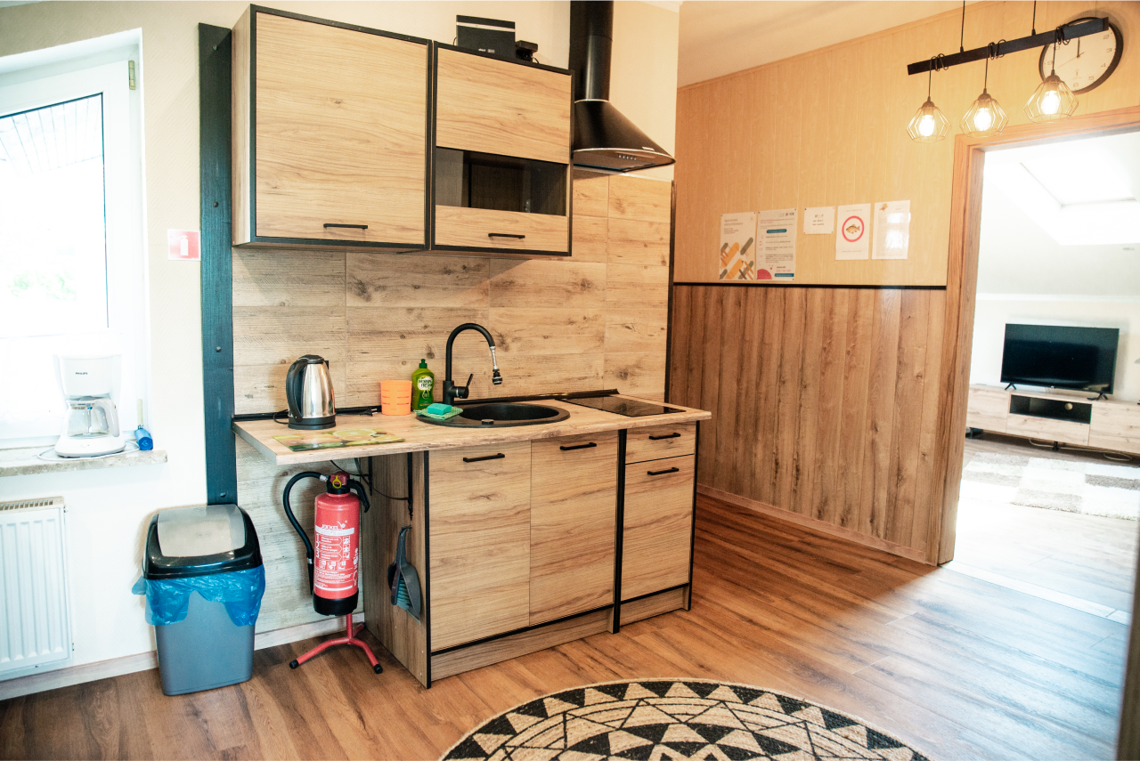 mikrofala, lodówka, kuchenka indukcyjna, czajnik bezprzewodowy, garnki, patelnia, talerze, sztućce, szkło, stół na 4 osoby