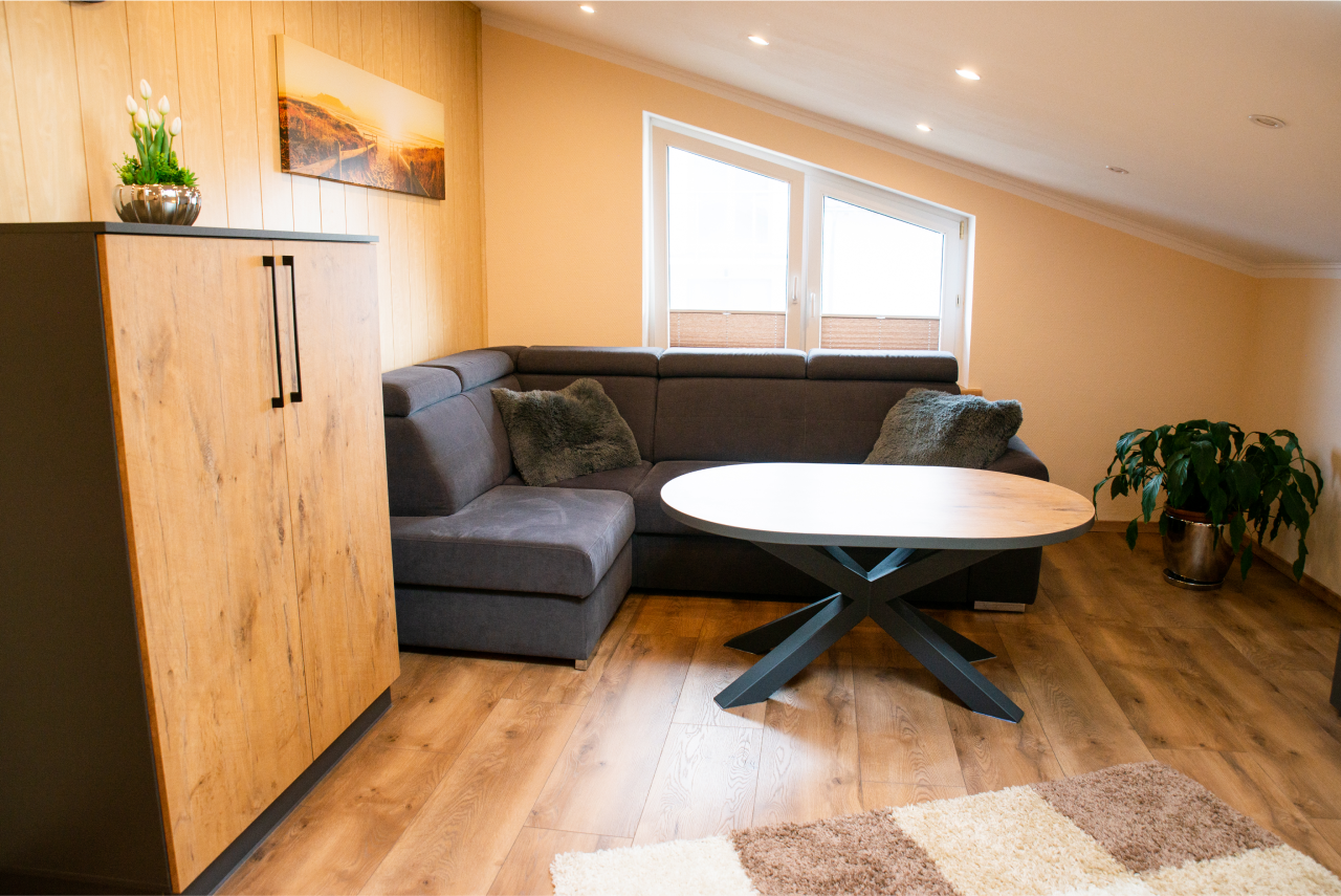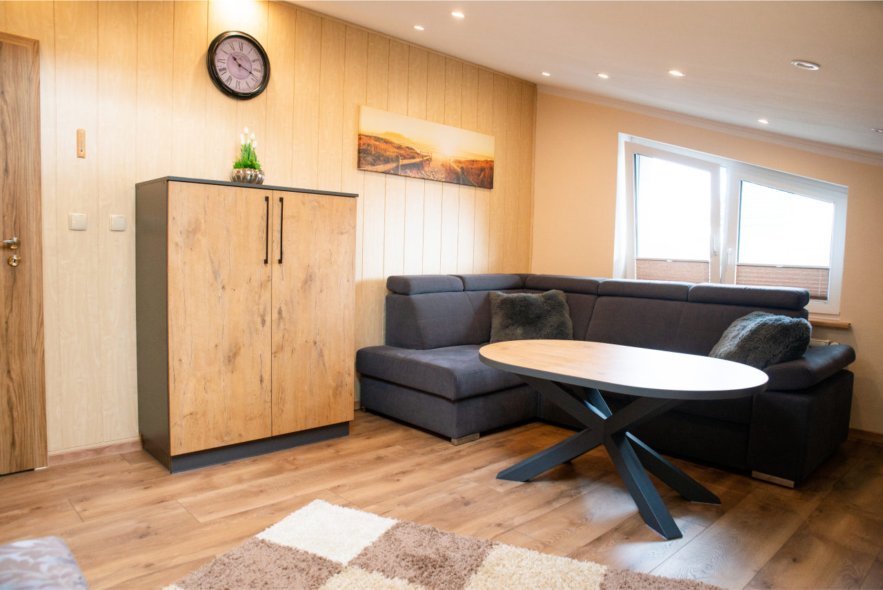 Narożna kanapa z funkcją spania, łoże małżeńskie, szafa, TV.